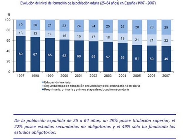 “….La formación alcanzada por la población adulta española ha mejorado, de forma ininterrumpida, en los últimos 10 años. Desde 1997 el porcentaje de españoles de 25 a 64 años que poseen Educación Secundaria postobligatoria o superior ha pasado de 32% al 51% en 2007. En la misma proporción ha disminuido, por tanto el porcentaje de españoles que sólo poseen estudios obligatorios, que ha pasado del 69% en 1997 al 49% en 2007”