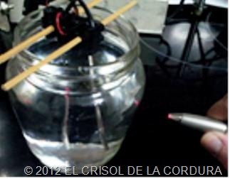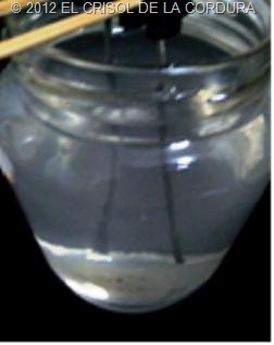 Un tarro de cristal que las varillas no toquen en el fondo y lo llenamos con 300 cc de agua destilada o mejor de la marca Bezoya, que hemos comprobado es la que tiene menos minerales y no se altera en el proceso.