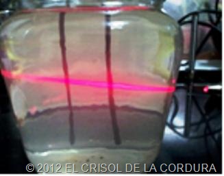 Conforme pasan los minutos, con una linterna láser, (cualquier puntero vale)puedes apreciar como el haz de luz del laser al principio no se aprecia al traspasar de lado a lado el vidrio y después se va formando una raya de luz cada vez mas intensa y continua, cuando aumentan las partículas que se depositan en el agua.
