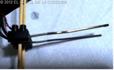Dos varillas de plata pura de 140 mm de largo y 2,5 mm de grueso, las conectamos mediante una ficha de conexión a los terminales: + y – de un transformador de corriente continua 24 v.